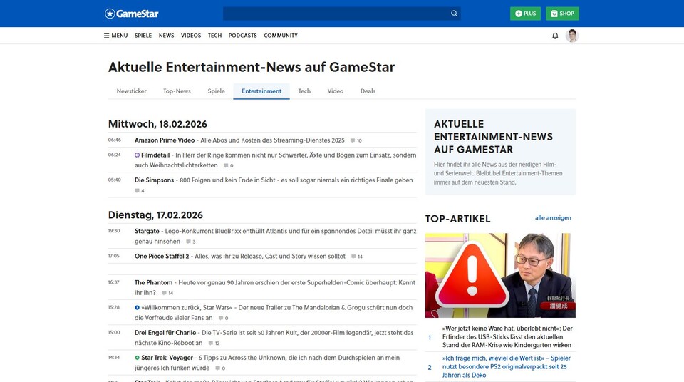 Eigener News-Filter: Auch unter GameStar.de/News bekommt Entertainment eine eigene Tab-Heimat, unter dem Spiele-Tab findet ihr entsprechend künftig ausschließlich Gaming Content. Und fürs volle Programm mit allem, was wir auf die Seite toasten, gibt’s nach wie vor den Newsticker.