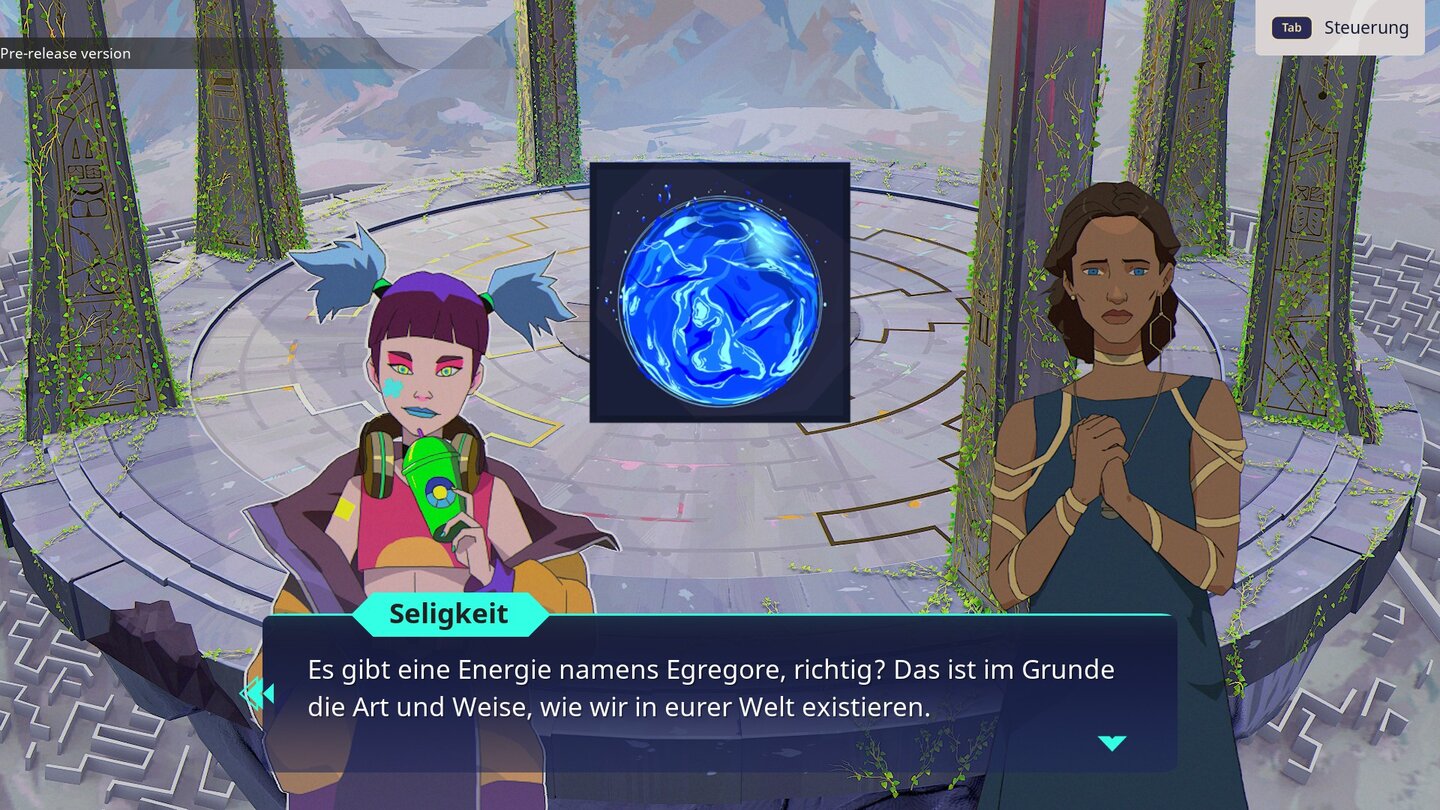 Obwohl ich mich wie in einer Visual Novel lediglich durch Dialoge und Text-Bildschirme klicke, fühle ich mich anfangs überfordert. Hinzu kommt noch ein Kodex mit noch mehr Info-Overkill über Oxions (eine untergegangene Zivilisation) bis hin zu Egregore (ein übersinnliches Mineral, das die Zukunft sichtbar macht). Ein gemächlicherer Einstieg hätte dem Spiel gutgetan.
