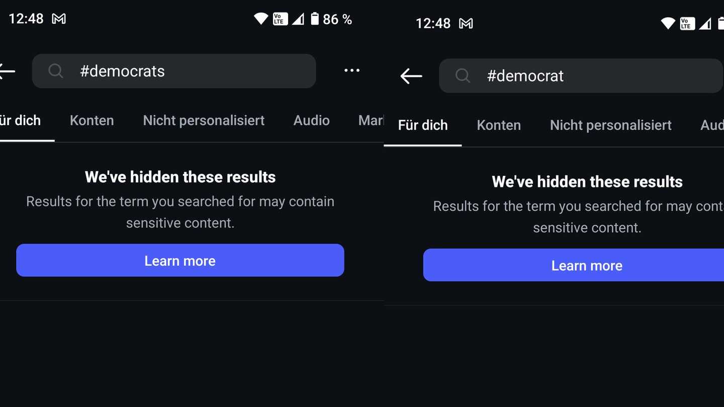 Wir haben es selbst ausprobiert: Dafür haben wir mehrere redaktionsinterne Instagram-Konten verwendet und in den Einstellungen das Anzeigen von mehr politischen und sensiblen Inhalten aktiviert. Unsere Ergebnisse unterscheiden sich dabei von Konto zu Konto, teils gesperrt waren die folgenden Hashtags: