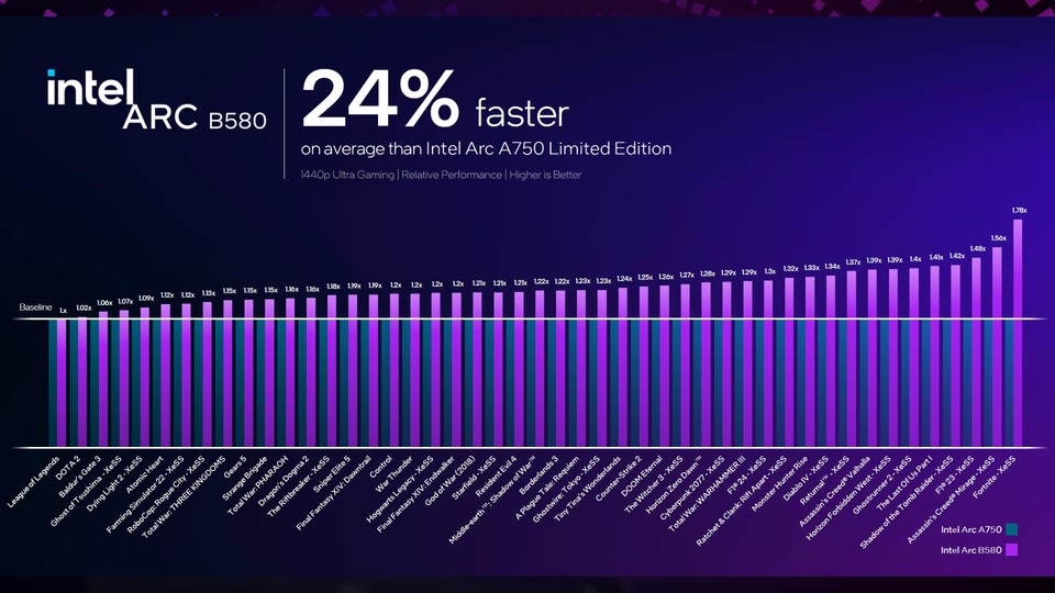 - Im Vergleich zum eigenen Vorgänger in Form der Arc A750 will man sogar noch überlegener sein: Im Schnitt verspricht Intel einen Performanceschub von rund 24 Prozent. Ein Benchmarkvergleich zu einem AMD-Modell findet sich in der Vorschau indes nicht.