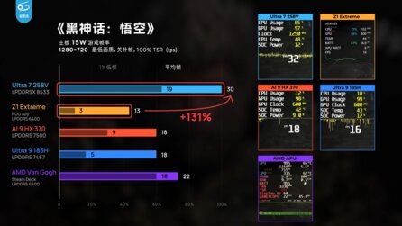 - Black Myth Wukong (15W, 720p): Der Ultra 7 258V setzt sich an die Spitze und schafft sogar eine mehr als doppelt so hohe Framerate als der Ryzen Z1 Extreme.