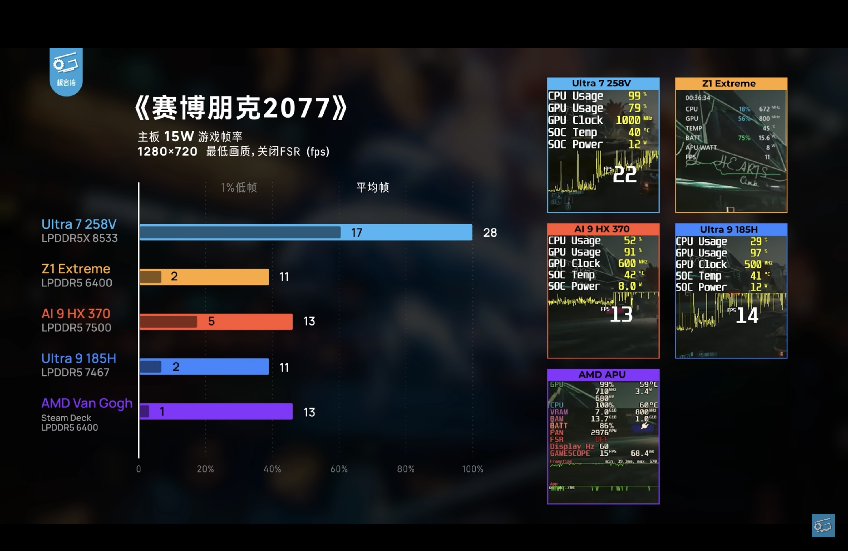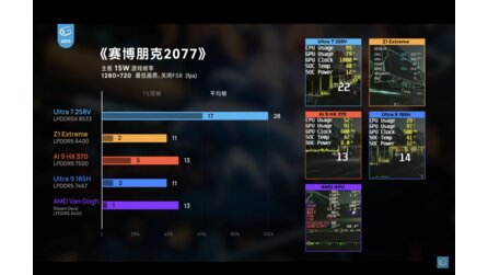 - Cyberpunk 2077 (15W, 720P): Der 258V erreichte 28 FPS – fast doppelt so viel wie Z1 Extreme, HX 370, 185H und die Van Gough APU, die alle im niedrigen Zehnerbereich lagen.
