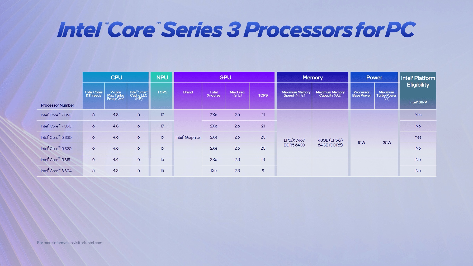 - Intel Core 3 304: 5-Kerne mit bis zu 4,3 GHz.
