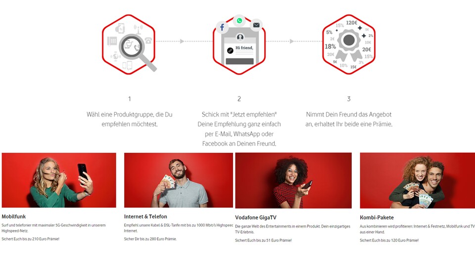 Diese Recruit a Friend Aktion klingt ja schon ganz verlockend, aber wie funktioniert das Ganze? Geht ganz einfach auf die Vodafone Seite und wählt welche Kategorie ihr empfehlen wollt (Mobilfunk, Internet & Telefon, Vodafone GigaTV oder Kombi-Pakete). Je nach Kategorie können die Prämien unterschiedlich hoch ausfallen.
