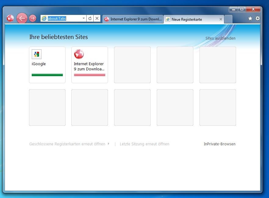 Öffnet man einen neuen Tab, dann zeigt der Internet Explorer 9 Beta die vom Anwender am häufigsten aufgerufenen Websites an. Kleine Balken unter dem Namen der Website signalisieren, wie häufig der Anwender die betreffende Website genutzt hat. Ein langer Balken signalisiert beispielsweise, dass die Website besonders häufig aufgerufen wurde. Die Farbe des Balkens hängt übrigens von der Farbe ab, die das Website-Logo der Seite primär verwendet.