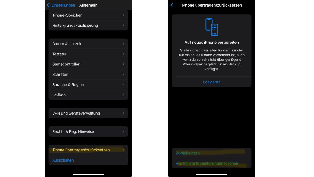 - Setzt das iPhone auf die Werkseinstellungen zurück. Dies ist die letzte Option, die manchmal nach einem iOS-Update notwendig ist, wenn Dinge nicht mehr funktionieren. Die Funktion versteckt sich unter Einstellungen → Allgemein → iPhone übertragen/zurücksetzen. Versucht es zunächst mit einem einfachen