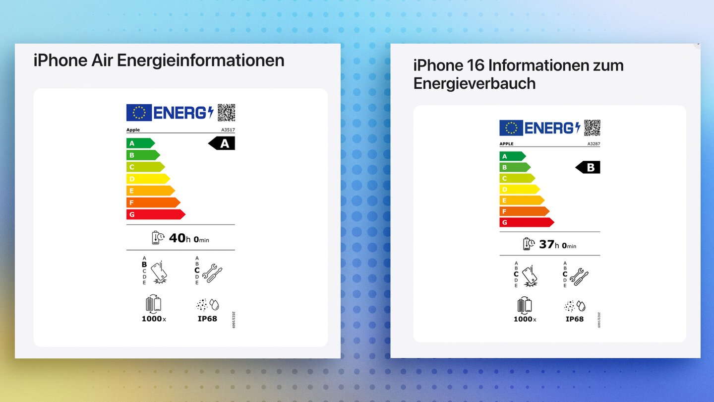 Das EU-Energielabel attestiert dem iPhone Air eine Akkulaufzeit von 40 Stunden und die A-Effizienzklasse. Das iPhone 16 kommt auf 37 Stunden und B-Effizienzklasse.