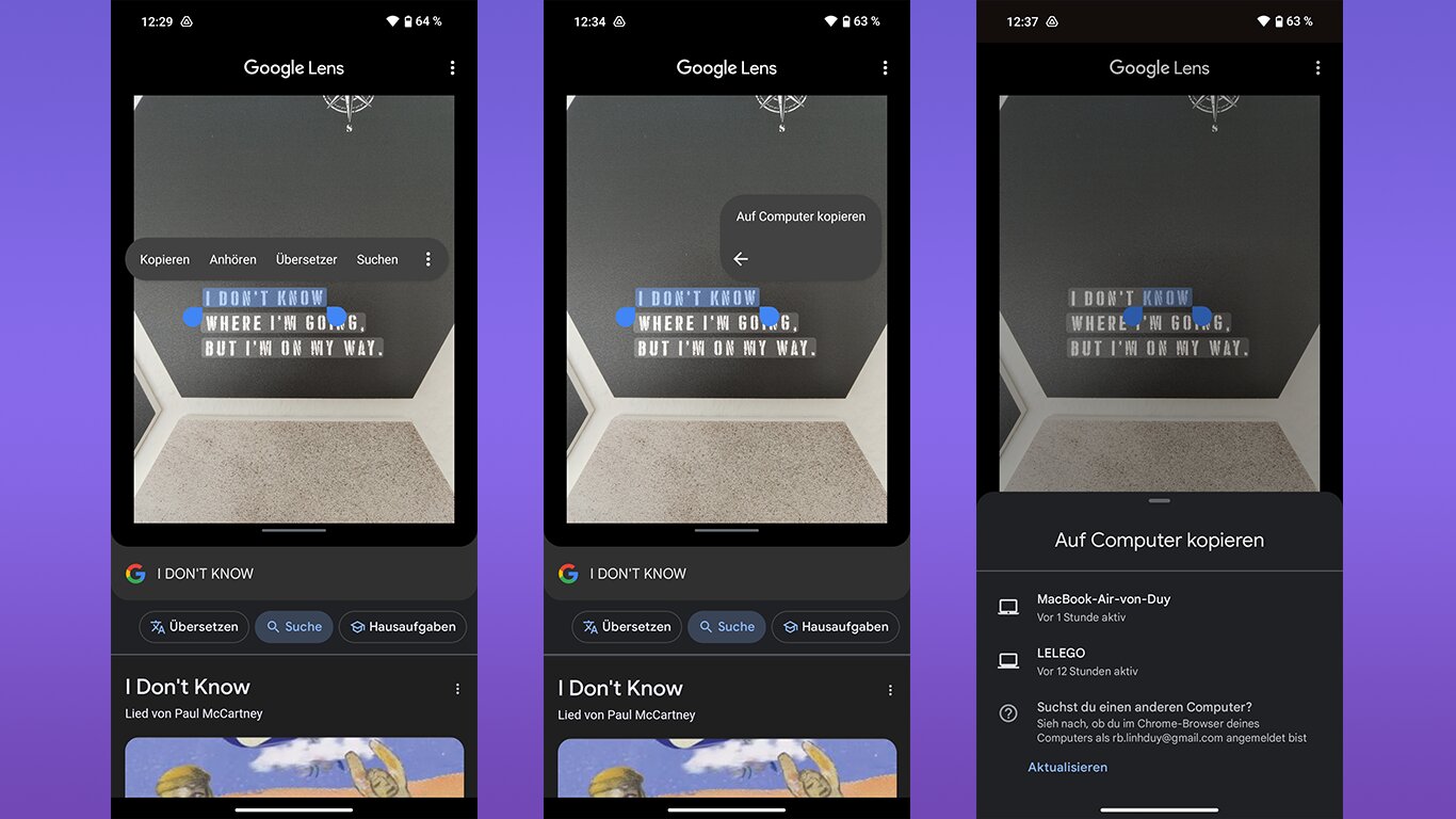 Mit Google Lens: Öffnet ein gespeichertes Foto mit Textinhalt mit Google Lens. Anschließend könnt ihr mit dem Finger auf den Text gedrückt halten, um ihn zu markieren und aus einer der verfügbaren Optionen zu wählen. Einige Handys haben Google Lens in der Kamera-App integriert.