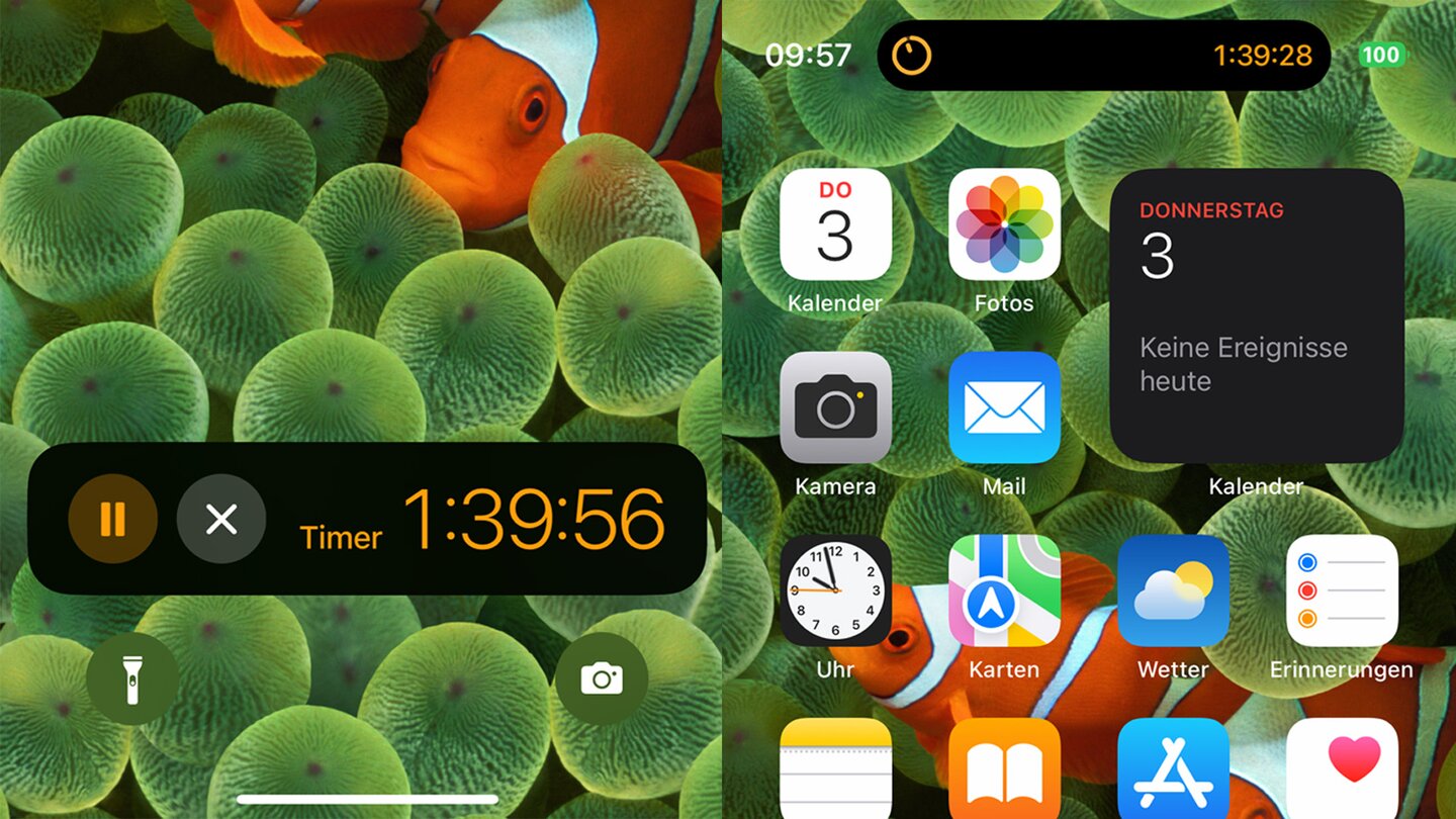 Die iPhone-eigene App für Uhrzeit und Wecker präsentiert sich neuerdings auch auf dem Lock-Screen, indem ihr einen Timer erstellt. Sobald ihr eine Dauer festgelegt habt, könnt ihr die ablaufende Zeit auf eurem Bildschirm einsehen, ohne das iPhone zu entsperren.