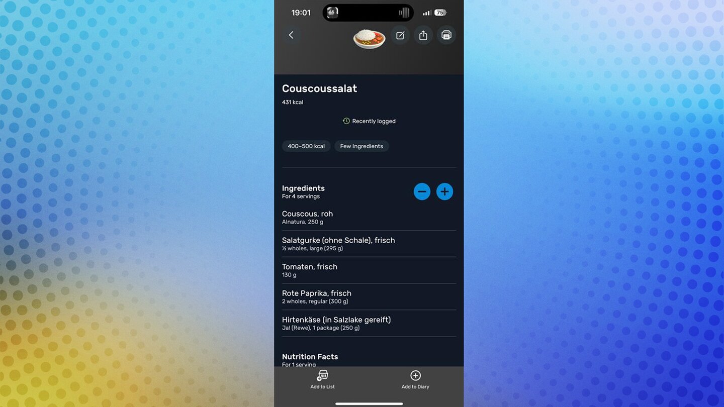 Besonders stark: Mit der App könnt ihr Barcodes von Lebensmitteln scannen. Das funktioniert in meinem Test recht gut. Für mich aber eher ungünstig: Ich koche am liebsten selbst – da ist es müßig einzelne Zutaten in die App einzugeben.