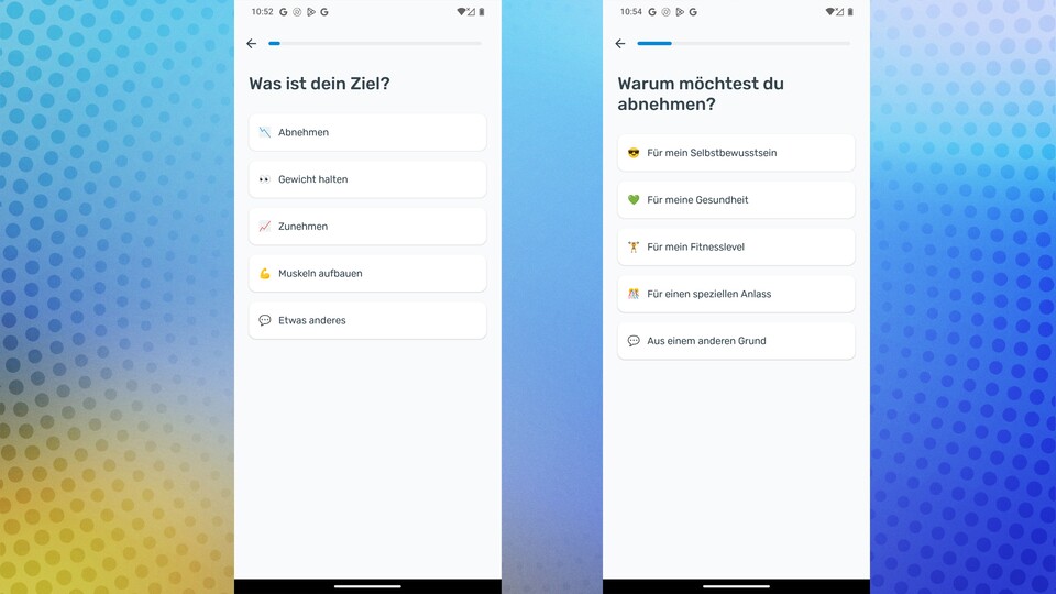 Ich starte meine Abnehmreise euphorisch. Doch bevor es mit der YAZIO-App richtig losgeht, darf ich mich durch eine Reihe von Willkommens-Screens tippen. Die App will wissen, ob ich motiviert bin, bestärkt mich, dass ja Millionen Menschen Teil der YAZIO-Community sind.