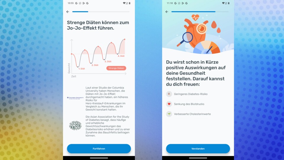 Dieser Onboarding-Prozess gibt sich motivierend und informativ. Aber nach minutenlangem Tippen komme ich mir ein bisschen vor, als würde ich einer Sekte beitreten. Immerhin: Ich habe mein aktuelles Gewicht und ein Wunschgewicht eingegeben. Die App berechnet mir anhand meiner Eingaben (was will ich schaffen und wie schnell) ein Datum, wann ich es wohl erreichen werde. Das ist doch mal ein konkretes Ziel.