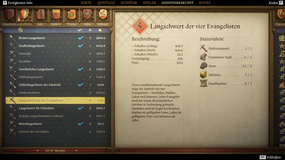 Das Schwert ist das Langschwert der vier Evangelisten – eine der besten Waffen im ganzen Spiel! Jetzt könnt ihr euch dran machen, das Schwert zu schmieden. Ihr braucht dafür: