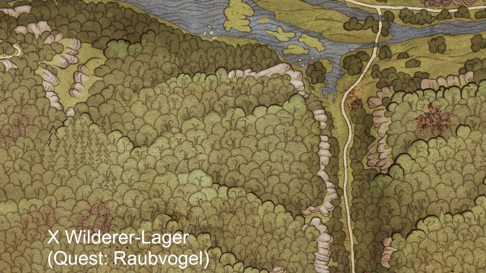 Der erste Halunke zieht nachts in den östlichen Wäldern direkt am Steinturmsee umher. Das ist nahe der Stelle, an der Heinrich und sein Gefolge zu Beginn der Reise hinterhältig überfallen wurden. Links von einer verfallenen Hütte am Wegesrand führt ein kleiner Pfad in den Wald hinauf zu einem Lager ((2)).