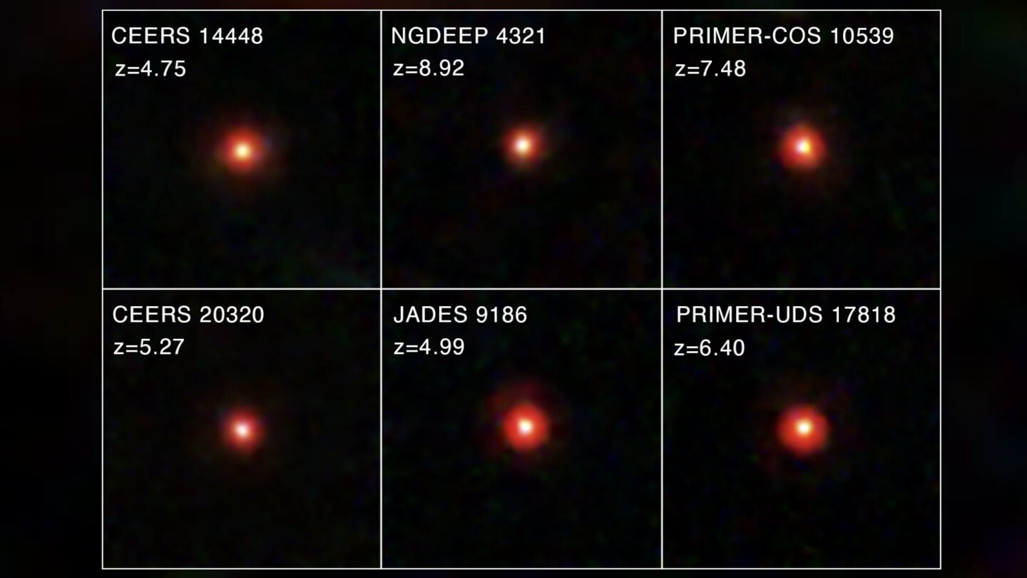 Die kleinen roten Punkte stellen eines der zentralen Mysterien der modernen Weltraumforschung dar. Ihr Licht ist stets zwölf bis 13 Milliarden Jahre unterwegs. Es brach auf, als das Universum erst 0,6 bis 1,6 Milliarden Jahre alt war.