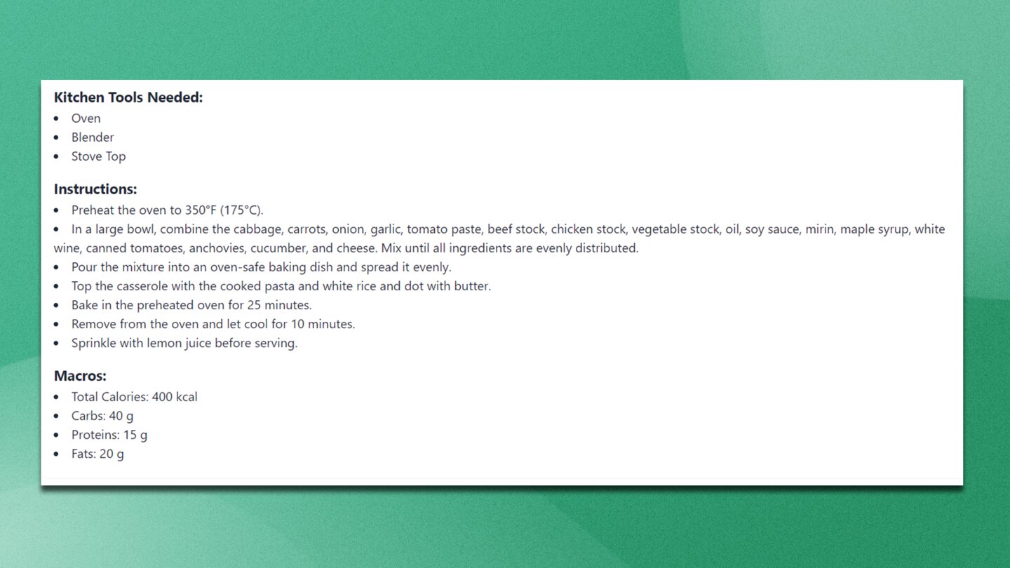 Bei allen guten Küchengeistern! Punkt für dich, ChefGPT, aber was ist, wenn ich dich alle Zutaten verwenden lasse? Bekomme ich dann mehr als bloß Eintopf? Seht selbst: