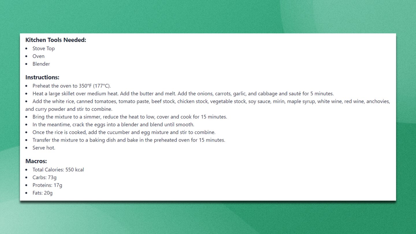 Um ChefGPT noch eine Chance zu geben, habe ich mit den Parametern herumgespielt, mein Aktivitätslevel auf hoch gesetzt und angegeben, dass ich Muskeln aufbauen möchte - ohne Erfolg. Alle Rezepte waren mehr oder minder dieselben. Keine Finesse, keine Küchen, obwohl die KI bewiesen hat, dass sie sie kennt.
