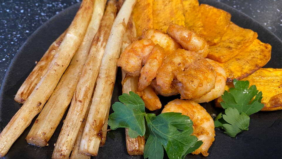 - Shrimps mit Spargel und Süßkartoffeln