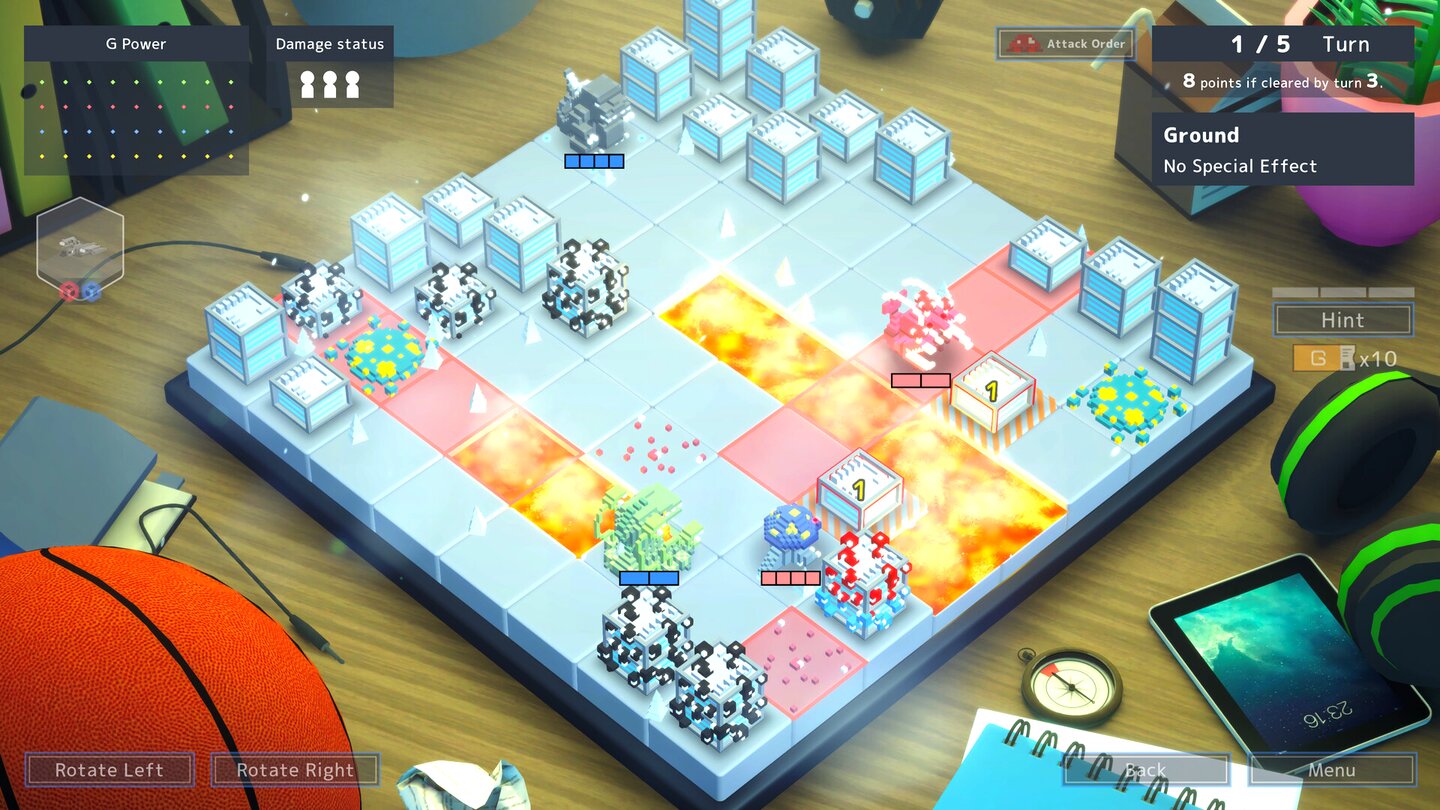 Jedes Level ist ein kleines Puzzle, das ihr in möglichst wenig Zügen lösen müsst und bei dem ihr kleine Zusatzaufgaben absolvieren könnt. Wer Into the Breach kennt, fühlt sich direkt abgeholt - nicht nur wegen des Pixel-Looks.