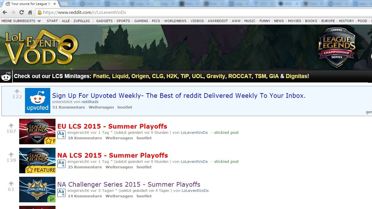 Beste Anlaufstelle für League of Legends-Events ist unserer Erfahrung nach das Subreddit LoLEventVoDs, und das gilt auch für die Playoffs der europäischen und der amerikanischen Liga. In den Reddit-Beiträgen zu den Playoffs finden Sie eine Übersicht mit den wichtigsten Infos, Links zu den Live-Streams auf Twitch.tv, Youtube und Azubut.tv und nach den Spielen alle VoDs sowie Highlight-Clips für die Interessierten mit weniger Zeit.