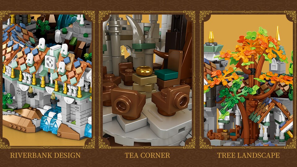 In jeder Ecke ein schönes Stück aus Herr der Ringe! Aber ist das überhaupt Herr der Ringe? Nicht offiziell, denn wie bei vielen Klemmbaustein-Marken, sind die Lizenzgebühren eine Ausgabe, die man sich oft sparen will. Darum muss man mit den Namen etwas kreativ sein. Es ist ja auch nicht Bruchtal, sondern »Tals-Stadt« und aus dem »Rat von Elrond« mit dem einen Ring wird eine Tee-Ecke. Na hoffentlich zimmert Gimli nicht seine Axt auf meine Lieblings-Tasse.