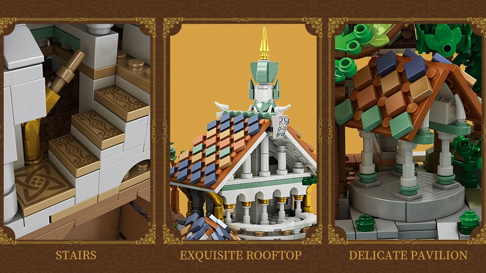 Herbstliche Bäume, Wasserfälle und imposante Fantasy-Architektur. Fast alles, was man am LEGO Bruchtal liebt, findet man auch in diesem »Tal-Stadt«-Bauset von Reobrix. Besonders schön finde ich die Dachziegel in verschiedenen Pastellfarben und die weißen Bögen. Ein absolutes Prachtstück aus insgesamt 4.406 Teilen!