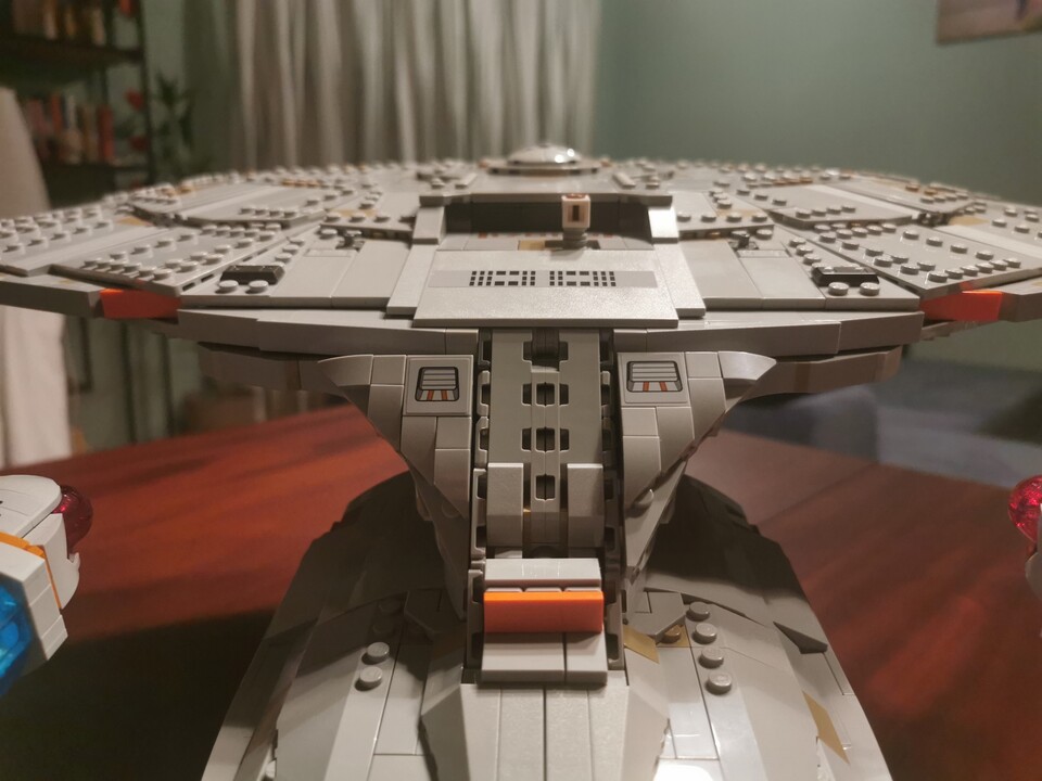Wer die Enterprise-D kennt, weiß, dass ihre beeindruckende Untertassensektion ein massiver Teil des Gesamtdesigns ist und im Notfall sogar abgetrennt werden kann. Das Lego-Set übernimmt diese Funktion und ist auf ihrem Ständer gut ausbalanciert, passt im Maßstab aber nicht zu den mitglieferten Minifiguren.