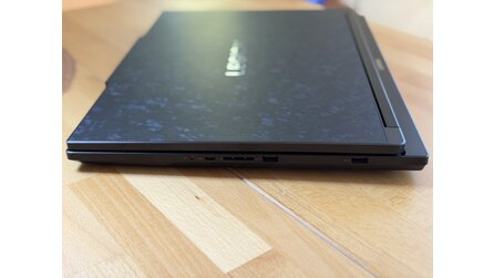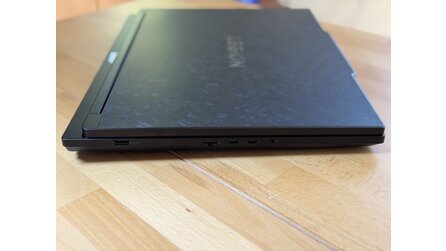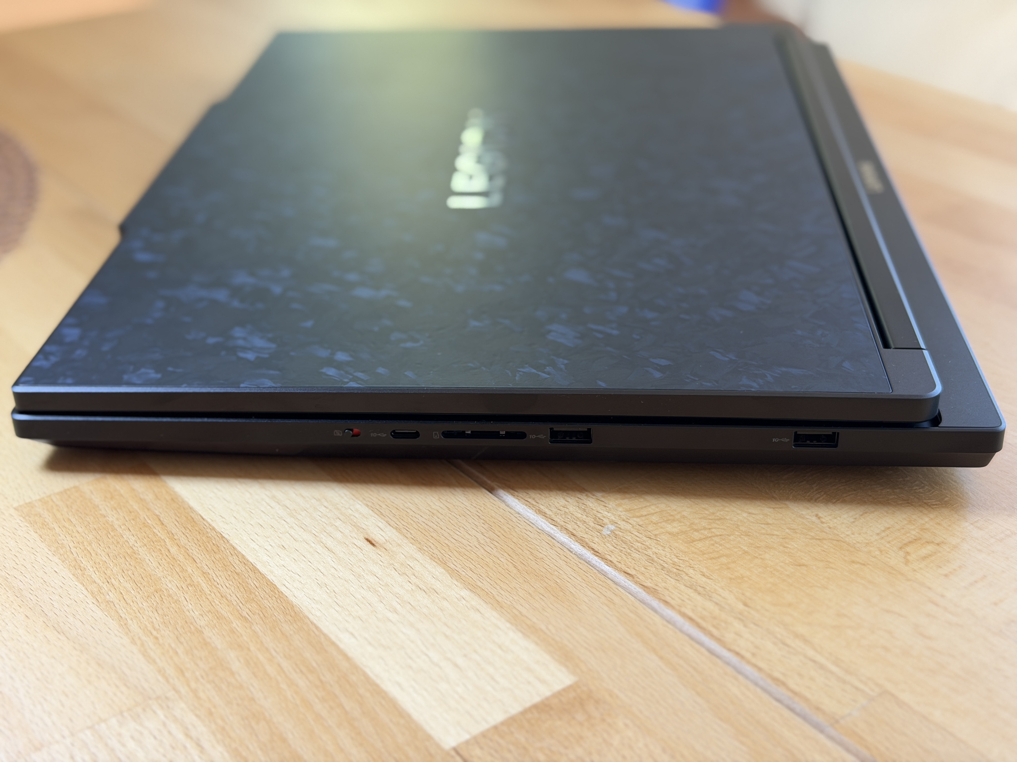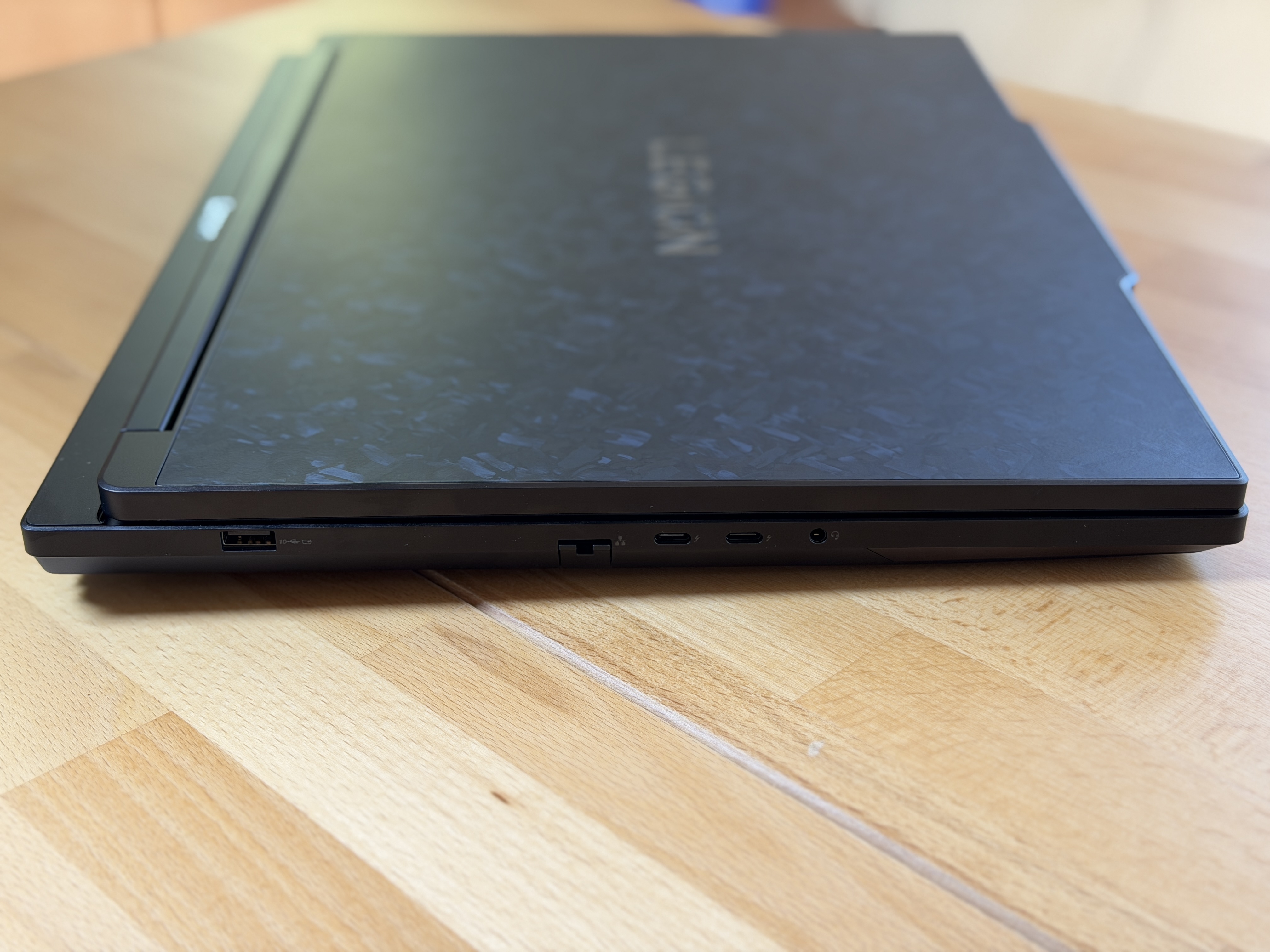 Das Gehäuse besteht laut Hersteller aus Magnesium, so steht es zumindest auf der Webseite. In den technischen Daten ist allerdings von Aluminium die Rede. Den Displaydeckel ziert ein Inlay aus echtem Carbon. Ich schreibe bewusst Inlay, denn es ist nicht überprüfbar, ob der komplette Deckel aus Kohlenstoff gefertigt wird.
