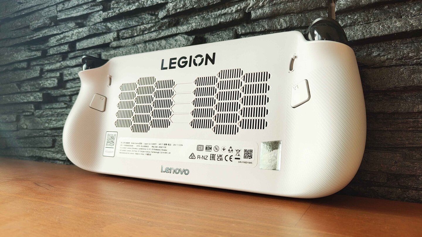 Tabletop und gedocktes Spielen: Der Lenovo Legion Go S hat keinen eingebauten Kickstand, weshalb ihr für Tabletop-Gaming einen separaten Ständer benötigt. In der Verpackung befindet sich immerhin einer aus Karton, der die Lüftungsschlitze nicht blockiert.