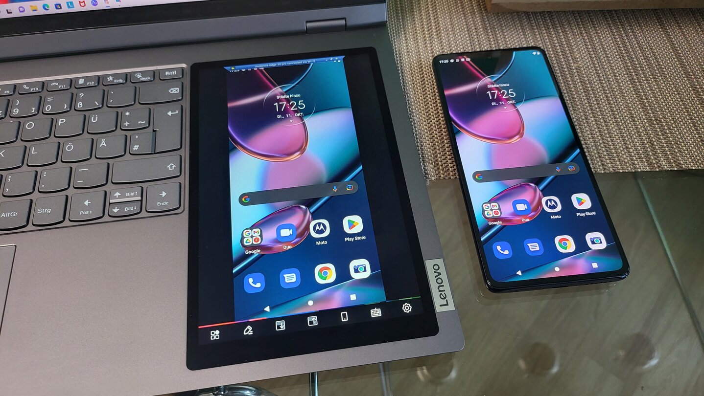 Das Koppeln geht dank des Scans eines QR-Codes kinderleicht, sodass sämtliche Nutzungsmöglichkeiten inklusive Datentransfer bei unserem Test mit einem Motorola Edge 30 Pro innerhalb von Sekunden zur Verfügung standen. Da diese Funktion aber Smartphones aller anderen Marken vorenthalten bleibt, kann sie leider nicht als echter Vorteil des Laptops gewertet werden.