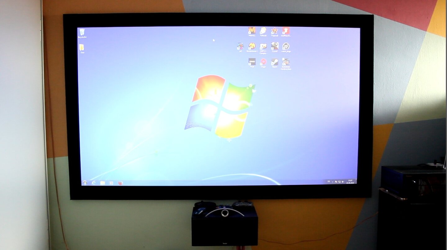 Wenn es ans Zocken geht, verzerrt die Interpretation unendlicher Datenkolonnen häufig die Wahrnehmung. Um dem entgegen zu wirken, wurde hier statt Latenzen zu messen dem subjektiven Eindruck der Tester vertraut-gerade bei einem Beamer, dessen Zielgruppe kaum Pro-Gamer sind, sondern viel mehr Unterhaltungsspieler, die einem unübertrefflichem visuellen Erlebnis gerne den Vorzug geben. Das Testszenario ist schnell erklärt: Lass möglichst viele Menschen möglichst viel Zeit mit möglichst vielen verschiedenen Spielen und dem Beamer verbringen. Ein kleiner Auszug aus der Liste der Spiele: Die Battlefield-Reihe, Wolfenstein, Metro: Last Light, die Fallout-Reihe, Borderlands 2, Counter Strike Source, Jagged Alliance 2, Teso, Diablo 3, Quake 3, WoW, Far Cry 3, Tomb Raider, CoD, Thief, Anno, Tropico 5, Minecraft, Crysis 3, CIV, Assassin's Creed, Grid 2, Freelancer und viele, viele mehr. Damit ist nur ein kleiner Teil der angezockten PC-Titel genannt. Darüber hinaus wurde eine breite Fülle an Konsolen getestet. Was letztere betrifft, waren nur zwei Kandidaten auffällig, beide in Bezug auf das Hochskalieren. Besonders Mario Kart auf der N64 wird beim Hochskalieren derart verunstaltet, dass es erst nach einiger Eingewöhnung spielbar ist. Auf der anderen Seite steht die Xbox One. Diese ist zwar nagelneu, muss jedoch aufgrund der schwachen Rechenleistung der neuen Konsolengeneration ebenfalls auf die Hochrechnungskunst des Beamers vertrauen. Hier geschieht dies allerdings mit Bravour. Der Bildeindruck ist dem auf aktuellen TV-Geräten mindestens ebenbürtig.