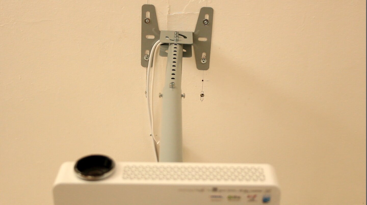 Da die wenigsten Wohnzimmer eine genau passende Stellfläche für den Beamer haben dürften, empfiehlt sich eine Deckenhalterung. Wird das Gerät über Kopf aufgehängt, muss die Linsenöffnung im 90 Grad Winkel zur oberen Leinwandkante stehen. Eine Neigung empfiehlt sich nicht, da wie bereits beschrieben, durch Ermangeln einer optischen Korrektur, eine Verschlechterung des Bildes auftreten würde. Sollte dies nicht zu vermeiden sein, sorgt eine integrierte Wasserwage für die automatische softwareseitige Korrektur. Auch einen Kopfstand verarbeitet die Sensorik automatisch. Bei einer durchschnittlichen Deckenhöhe kann der Beamer, sollte man eine exakte verlustfreie Montage bevorzugen, gut und gerne einen Meter dreißig in das Zimmer ragen.Die Wahl der richtigen Wand sollte also nicht nur von der Position der Lichtquellen abhängig gemacht werden sondern auch von der Position des Beamers. Unachtsamkeit schafft sonst entweder ein Hindernis im Raum oder gar die Gefahr, den Beamer durch Kopfstoß gewaltsam von seiner Halterung zu trennen.