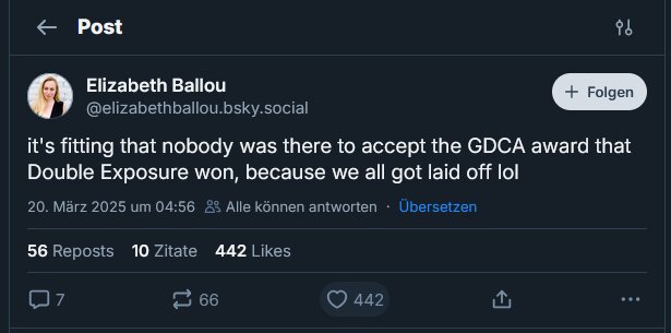 Das schreibt zumindest Elizabeth Ballou, frühere Narrative Designerin beim Studio Deck Nine auf BlueSky: Es ist passend, dass niemand da war, um den GDCA-Preis entgegenzunehmen, den Double Exposure gewonnen hat, weil wir alle entlassen wurden lol