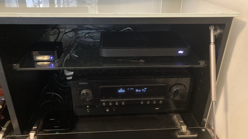 Kommen wir zu meinem Wohnzimmer-Setup: Aus den oben erwähnten Pedanz-Gründen ist mein gesamtes Elektronik-Geraffel in einem geschlossenen Hifi-Schrank verstaut. An einem Denon AV Receiver hängen meine PlayStation 5 Pro, eine Switch 2, ein Apple TV fürs Streaming sowie ein Sky Q Receiver für meinen Livesport. Der Fernseher befindet sich außerhalb des Schranks an einem Schwenkarm, außerdem besitze ich eine gescheite 5.1-Lautsprecheranlage, noch ganz oldschool verkabelt.