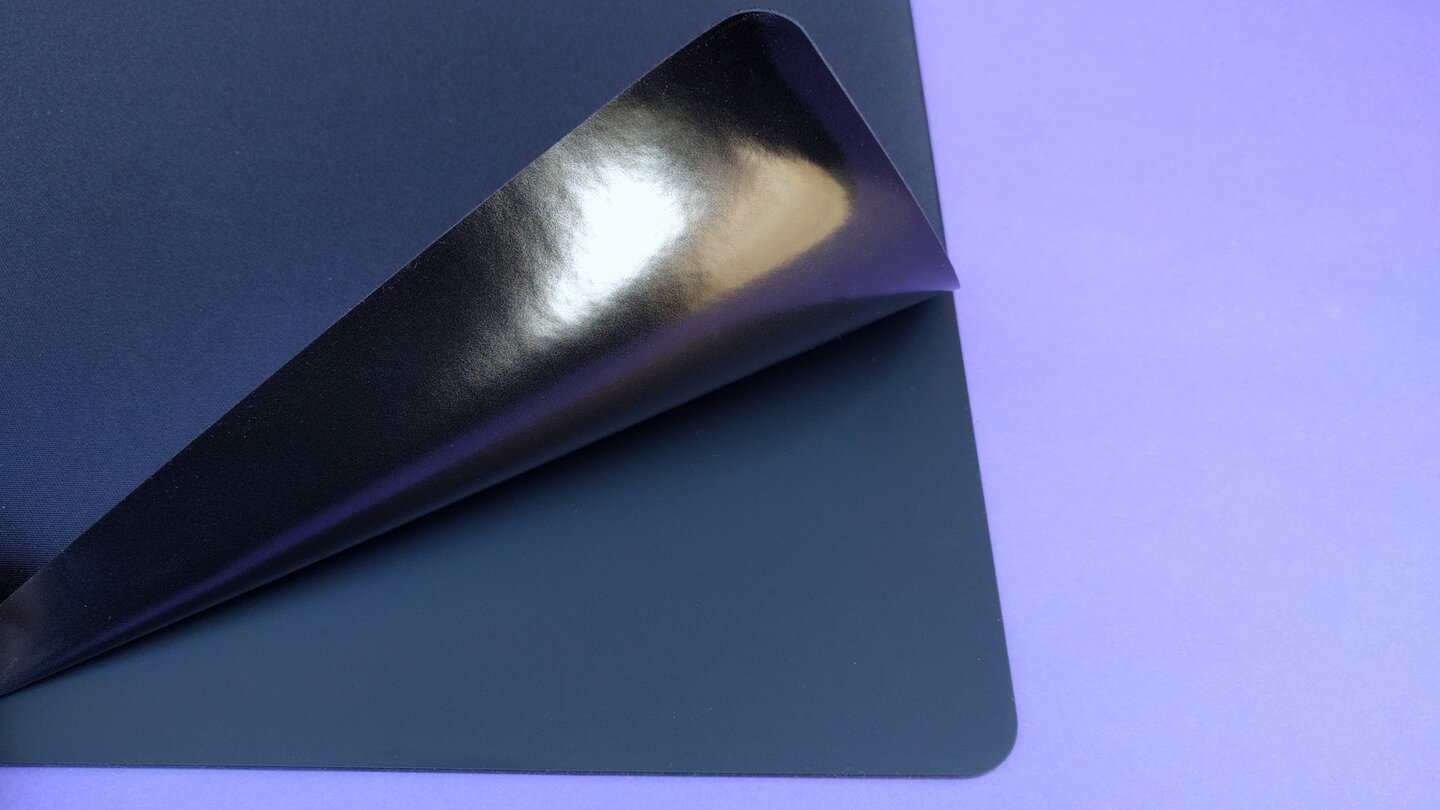 Das Lademauspad besteht aus zwei Matten. Eine ist hart und gummiert. Sie liegt unten. Eine darauf passende weitere, nur halb so dicke Matte aus dem typischen, nylonstoffartigen Material wird dort drüber gelegt.