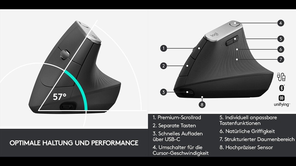 Von Batterieproblemen oder einem ständig leerem Akku könnt ihr euch ebenfalls verabschieden: Mit einer vollen Aufladung hält die MX Vertical bis zu vier Monate durch. Und wenn ihr es eilig habt, könnt ihr innerhalb von nur einer Minute genug Energie für drei Stunden Nutzungsdauer erhalten. Bisher habe ich die Maus erst einmal laden müssen und wurde positiv von der Ladegeschwindigkeit überrascht.