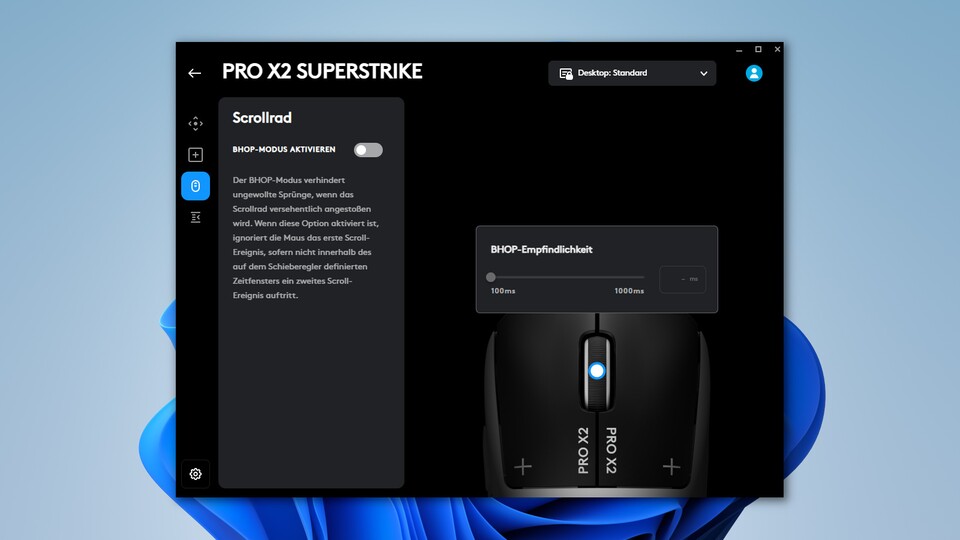 ): Das sind die wichtigsten Einstellungsmöglichkeiten der Logitech-Maus. Hier ist es möglich, den Betätigungsdruck und die Klick-Haptik zu verändern sowie den Schnellauslöser zu aktivieren. Mehr dazu erfahrt ihr auf den Bildern unten. - Scrollrad: Ihr könnt den BHOP-Modus einschalten. Der Name der Funktion spielt auf das Bunny Hopping in Shootern via Mausrad an. Ist der Modus aktiv, wird das erste Scroll-Ereignis ignoriert, wenn nicht in ausreichend kurzer Zeit ein zweites ausgelöst wird, um ungewollte Sprünge zu verhindern.