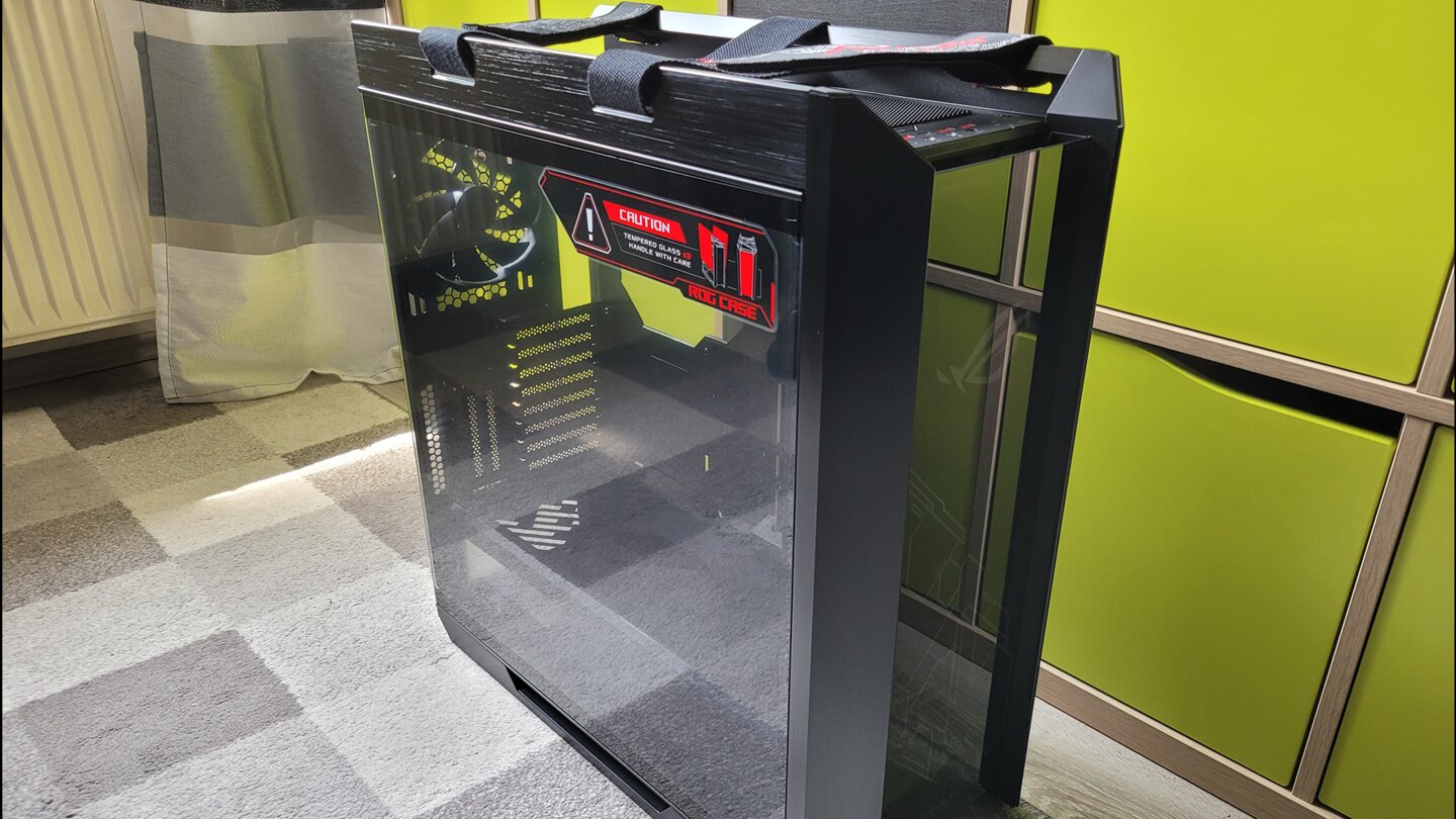 Das geräumige ASUS ROG Strix Helios dient als Gehäuse für den PC. Trotz des Rahmens aus Aluminium, hat das massive Case immer noch ordentlich Gewicht. Die Front- und Seitenwände aus dickem, gehärtetem Glas sind dafür sicherlich mitverantwortlich.