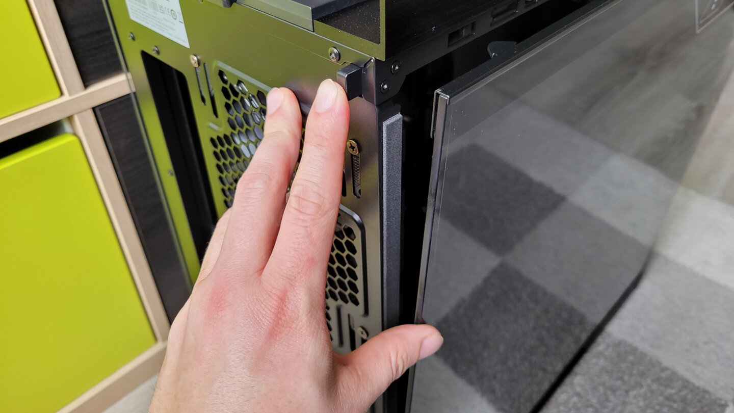 Das ROG Strix Helios ist da so unendlich viel angenehmer! Beide Seitenteile springen per simplem Tastendruck aus ihrer Halterung heraus und rasten beim Schließen mit einem befriedigenden »Klack« ganz ohne Gegenwehr wieder ein.