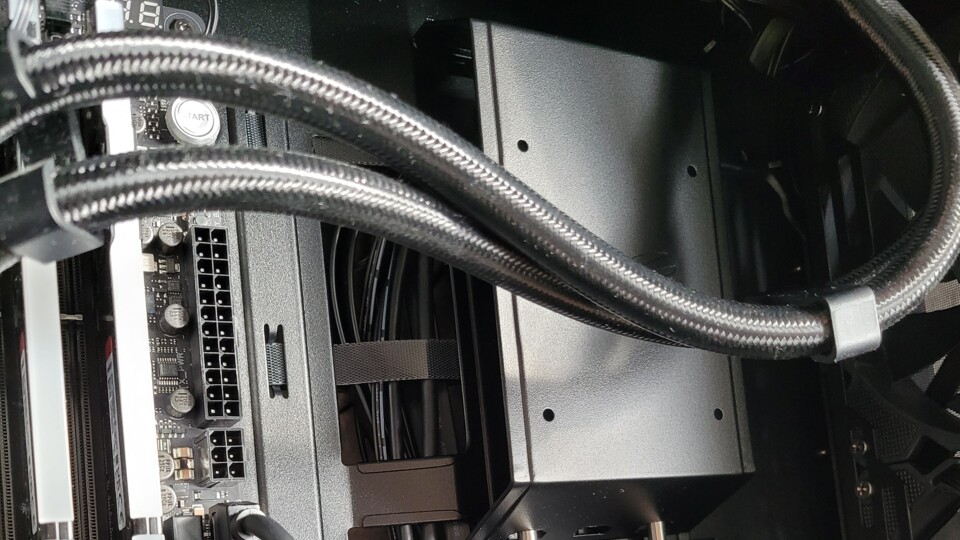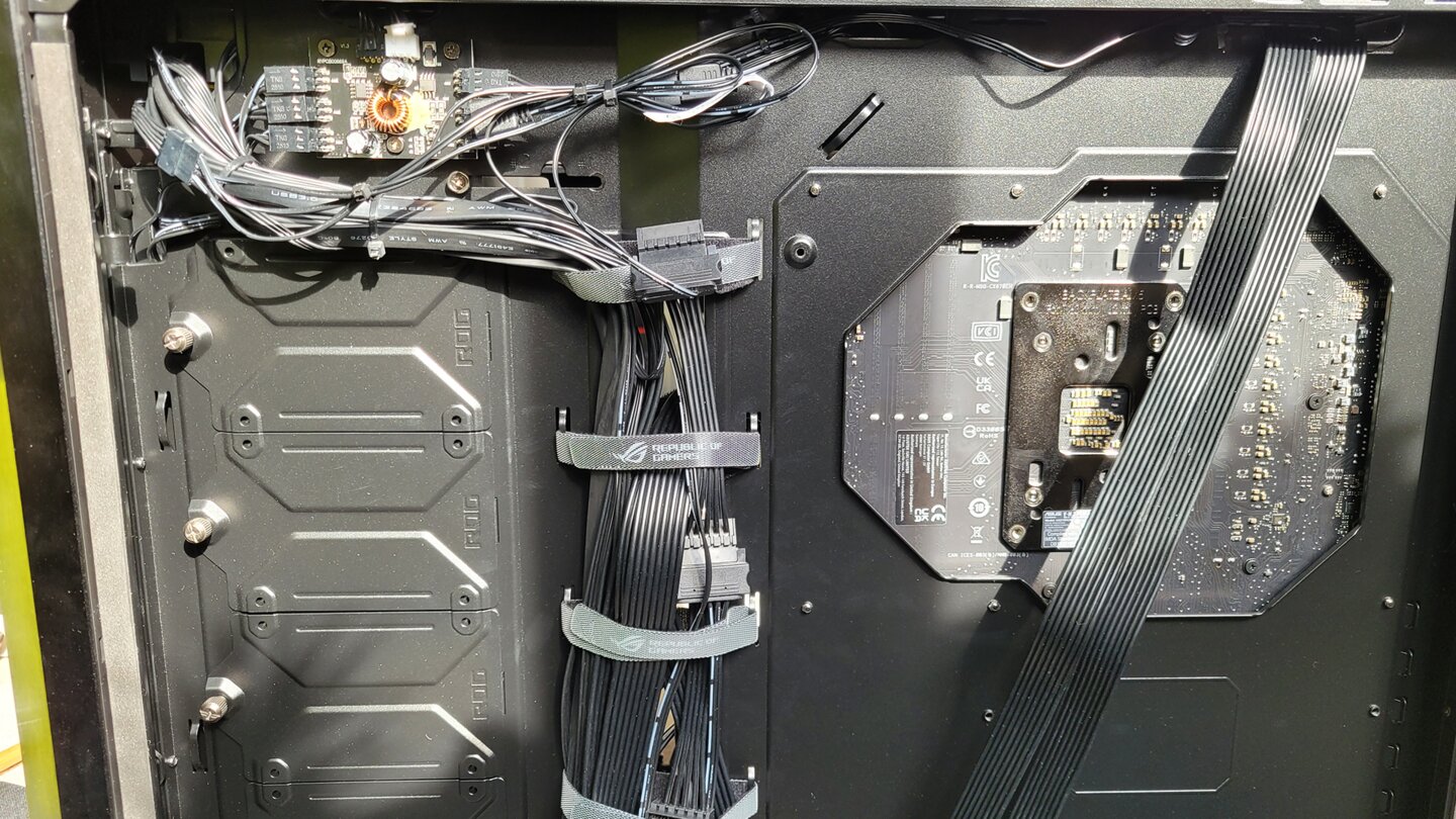Auf der Rückseite hat das ROG Strix Helios schon einige Kabelbinder mit Klett-Verschluss, mit denen ihr das Kabel-Wirrwarr bequem bändigen könnt. Diese sitzten genau hinter der beweglichen Blende, die ihr von vorne seht, also laufen dort ohnehin die allermeisten Kabel zusammen. Die beiden Stromkabel, die zur CPU führen könnte man noch verlängern und dann ebenfalls über die Mitte führen. Hier habe ich mir das erstmal gespart.