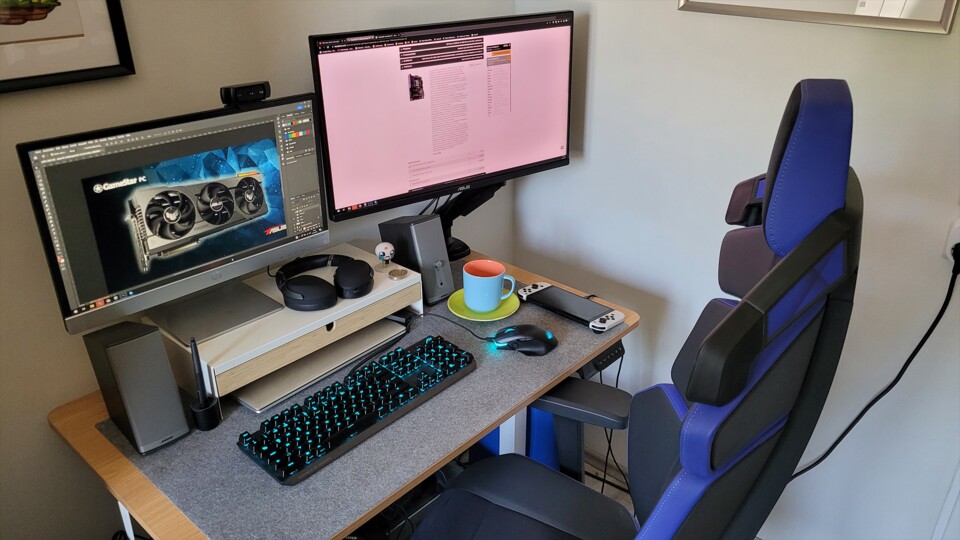 Mein Arbeitsplatz hat sich jetzt ganz schön gewandelt. Der neue PC strahlt mit Cleaner Optik und per ASUS Aura Sync synchronisierter RGB-Beleuchtung, die sich auch über die Peripheriegeräte erstreckt. Meine alte, deutlich größere Tastatur ist der kompakten ROG Strix Scope gewichen und die kabellose Gaming-Maus ROG Chakram macht mir das Navigieren in meinen Artikeln mit dem seitlichen Joystick leichter.