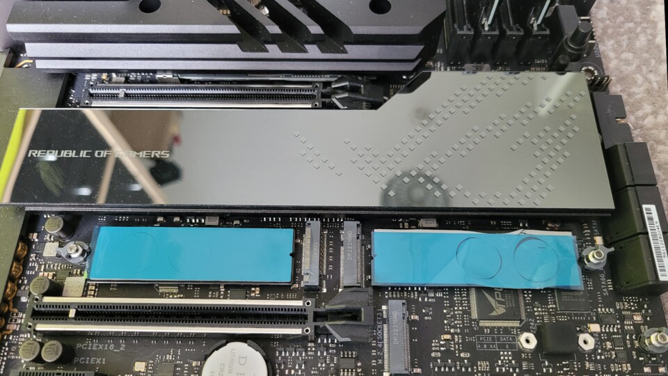 Die Steckplätze für die M.2 SSDs liegen gut versteckt unter massiven Kühlkörpern, die erstmal abgeschraubt werden wollen, bevor ihr die SSDs installieren könnt. Vorinstallierte Wärmeleitpads führen die entstehende Hitze an die großen Kühlkörper ab, die so Performance-Einbrüche verringern. Sind die Kühlkörper wieder drauf, sind die SSDs nicht mehr zu sehen und der ordentliche Look des Boards bleibt bestehen.
