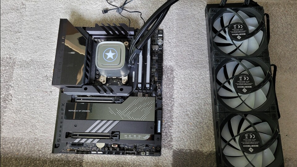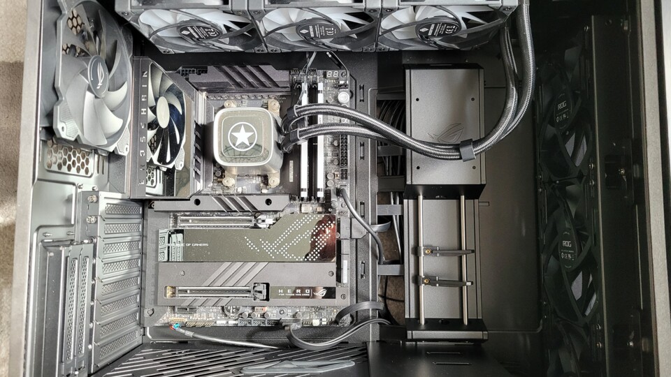 Mainboard und Kühler werden anschließend vorsichtig ins Gehäuse gesetzt und festgeschraubt. An der Oberseite des ROG Strix Helios ist reichlich Platz für den Kühlkörper der 360mm GameStar Wasserkühlung. Dort lauft ihr auch nicht Gefahr, sie falsch herum zu installieren.
