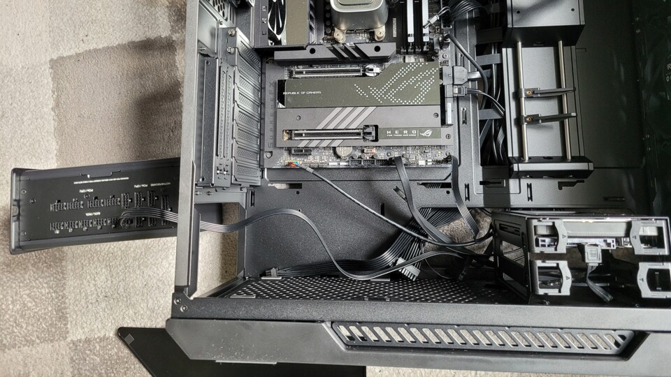 Die Blende rechts vom Mainboard lässt sich lösen und verschieben, um sämtliche Kabel bequem und unsichtbar über die Rückseite zu den entsprechenden Anschlüssen zu führen.