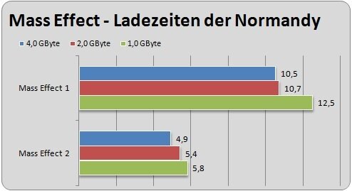 Im ersten Test lassen wir Commander Shepard auf dem Raumschiff Normandy im Aufzug von Stockwerk zu Stockwerk fahren. Während Sie im ersten Mass Effect noch rund zehn Sekunden warten müssen bis sich die Türen wieder öffnen, schafft Mass Effect 2 den Stockwerkswechsel in der Hälfte der Zeit. Ein abweichender Ausbau des Arbeitsspeichers macht dabei nur einen minimalen Unterschied.