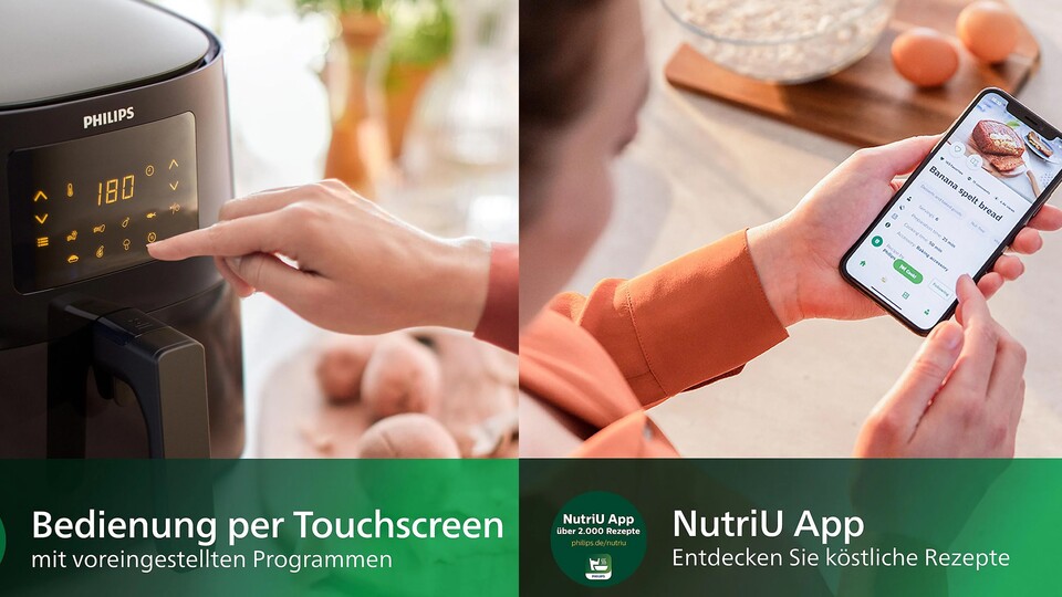 Eine Heißluftfritteuse ist eine sinnvolle Anschaffung, die nicht grundlos in immer mehr Haushalten steht. Ihr spart nicht nur bis zu 90% Fett, sondern auch noch eine Menge Strom. Noch sind die kleinen Öfen deutlich vielseitiger als man meint: Ob Quiche, Pommes oder gegartes Gemüse - ihr könnt hier richtig kreativ werden. In der NutriU-App bekommt ihr passend dazu tausende tolle Rezeptideen.