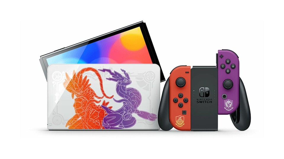 Des Weiteren sind auf der TV-Station die beiden legendären Pokémon der Spiele in den passenden Farben abgebildet. Auf der Rückseite des Handhelds finden sich zu dem Illustrationen der drei neuen Starter-Pokémon: Felori, Krokel und Kwaks. Insgesamt erwartet euch eine Nintendo Switch OLED, die in den Farben Orangerot und Lila gehalten ist und dabei Verzierungen aus den beiden neuen Spielen zeigt.