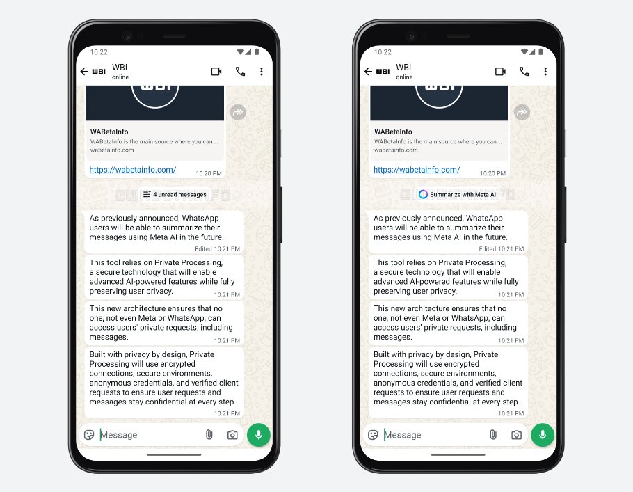 Auch auf die Möglichkeit, Zusammenfassungen mittels KI zu erstellen, wird hier hingewiesen. WABetaInfo betont, dass mittels Private Processing die Nachrichten verarbeitet werden, ohne dass Meta oder sonstige Drittanbieter Zugriff auf deren Inhalt bekommen.
