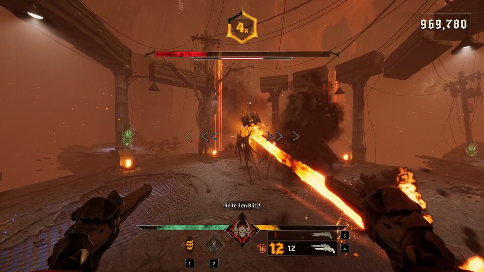 Die gewaltige Fledermausdämonin lässt Rammsteins Feuerwerkshows aussehen wie einen Kindergeburtstag und schleudert mir Feuerbälle, Laserstrahlen und Blitze entgehen, bis ich den Rhythmus vergesse und das Zeitliche segne. Zweimal kann ich pro Welt zurückkehren, danach muss ich ganz von vorne starten – Metal: Hellsinger kennt keine Gnade.