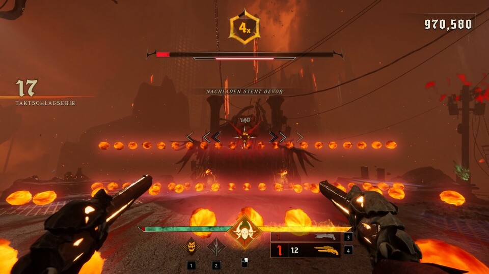 Das erklärt mir in wenigen Minuten, wie Metal: Hellsinger überhaupt funktioniert. Ich, eine namenlose Dämonin, hebe einen Schädel auf, der Feuerkugeln schießt und mit der Stimme von Troy Baker zu mir spricht – und schon darf ich den ersten Dämonen einheizen. Dazu schieße oder schlage ich im Rhythmus der Musik, der mir praktischerweise auch auf dem Bildschirm angezeigt wird. Je besser ich im Takt bleibe, desto mehr Schaden richte ich an, mit präzise ausgeführten Finishern heile ich mich.